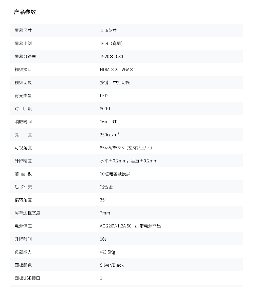 液晶屏基采用京东方高端系列,高清晰度,自研显示驱动模块,色彩还原度高,170度广视角,超窄边,高对比度,超薄显示屏;升降机采用一体成型铝合金框架,阳极氧化,精细喷砂工艺;人性化按键LED背光指示,充分做到简约,易用;内部升降系统,可靠、耐用、静音;本系列扩展性强,可满足用户各种应用需求。