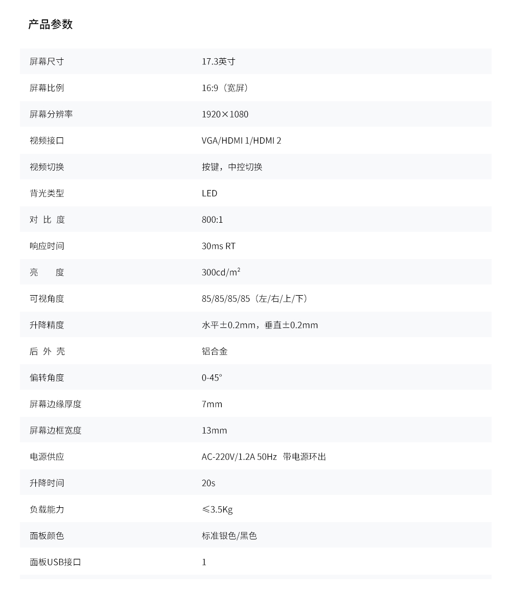 液晶屏基采用京东方高端系列,高清晰度,自研显示驱动模块,色彩还原度高,170度广视角,超窄边,高对比度,超薄显示屏;升降机采用一体成型铝合金框架,阳极氧化,精细喷砂工艺;人性化按键LED背光指示,充分做到简约,易用;内部升降系统,可靠、耐用、静音;本系列扩展性强,可满足用户各种应用需求。