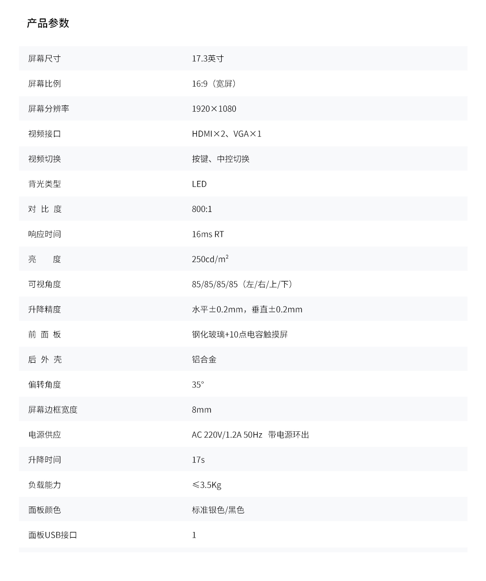 液晶屏基采用京东方高端系列,高清晰度,自研显示驱动模块,色彩还原度高,170度广视角,超窄边,高对比度,超薄显示屏;升降机采用一体成型铝合金框架,阳极氧化,精细喷砂工艺;人性化按键LED背光指示,充分做到简约,易用;内部升降系统,可靠、耐用、静音;本系列扩展性强,可满足用户各种应用需求。