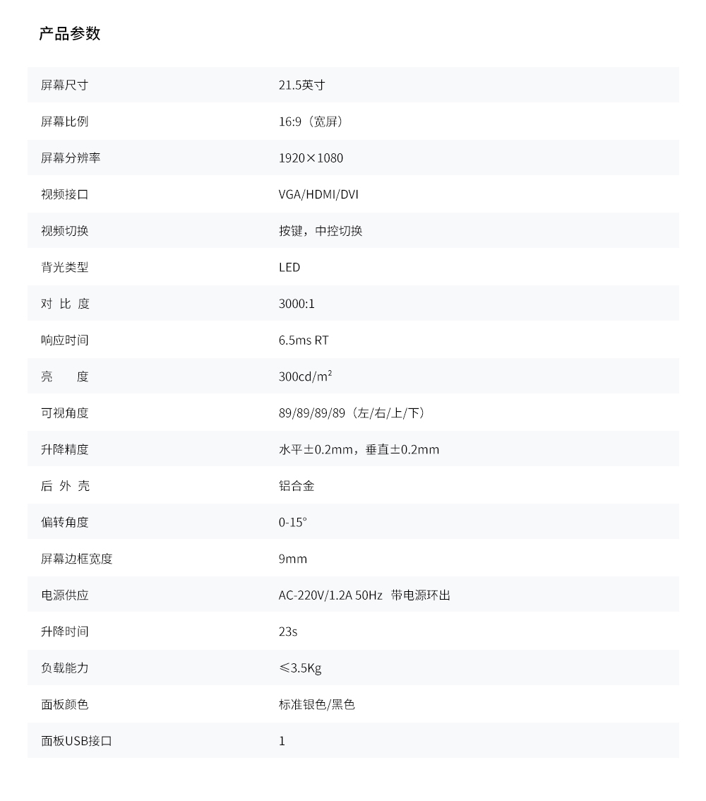 液晶屏基采用京东方高端系列,高清晰度,自研显示驱动模块,色彩还原度高,178度广视角,超窄边,高对比度,超薄显示屏;升降机采用一体成型铝合金框架,阳极氧化,精细喷砂工艺;人性化按键LED背光指示,充分做到简约,易用;内部升降系统,可靠、耐用、静音;本系列扩展性强,可满足用户各种应用需求。