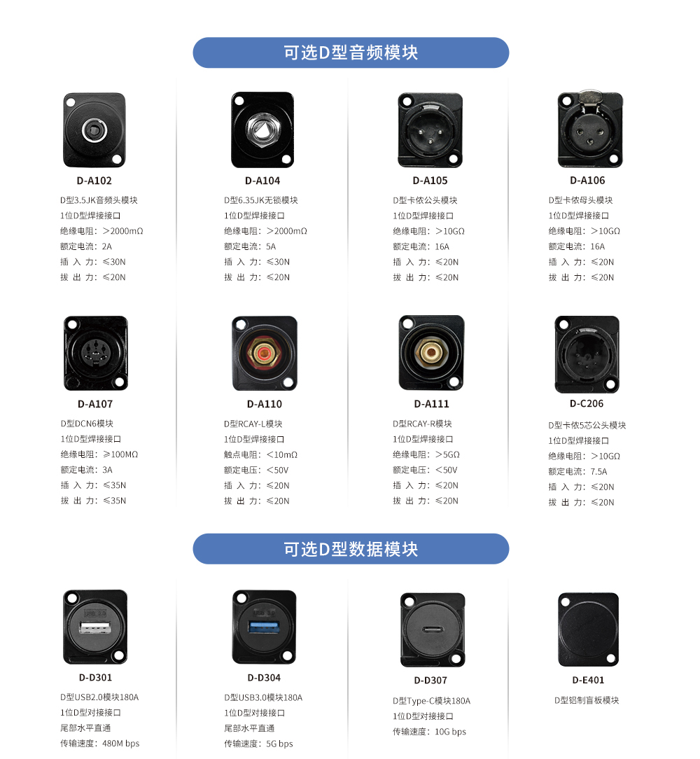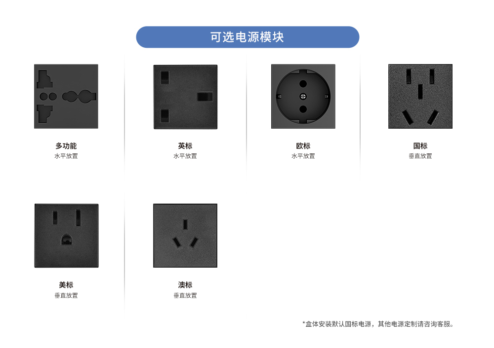 | 配置 | 一位5孔国标AC插座,六位可选D型接口模块,两位固定网络模块 |
