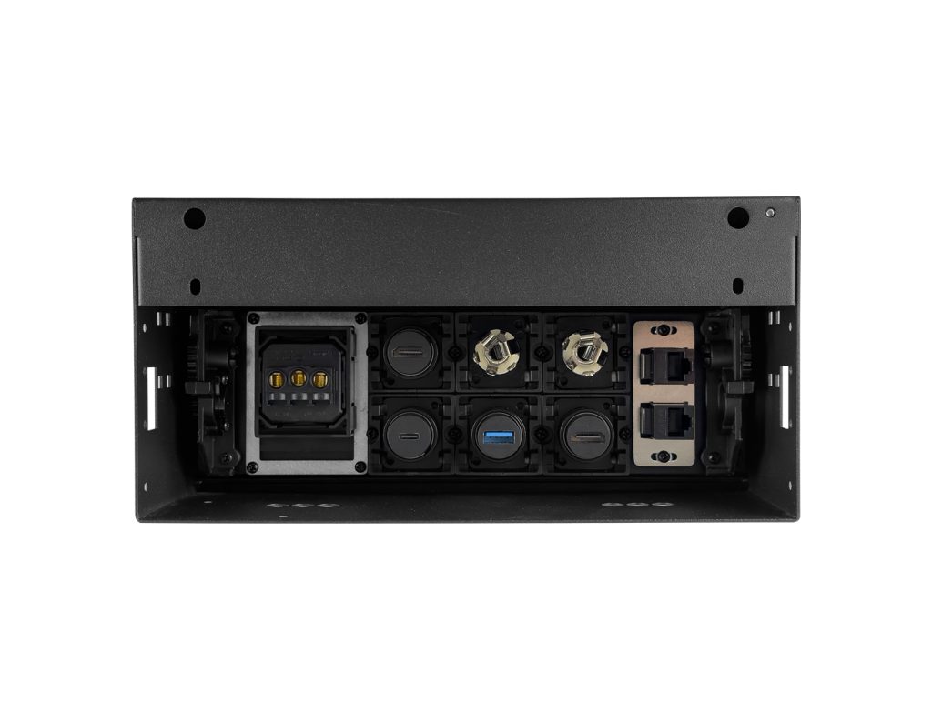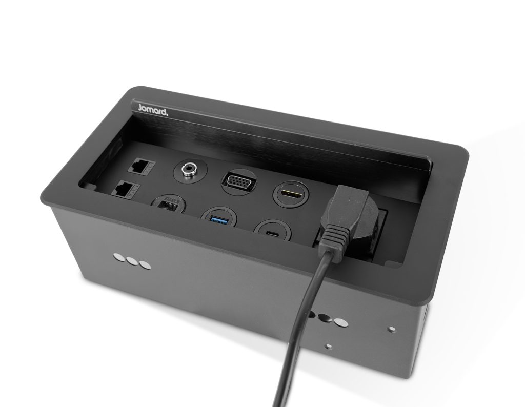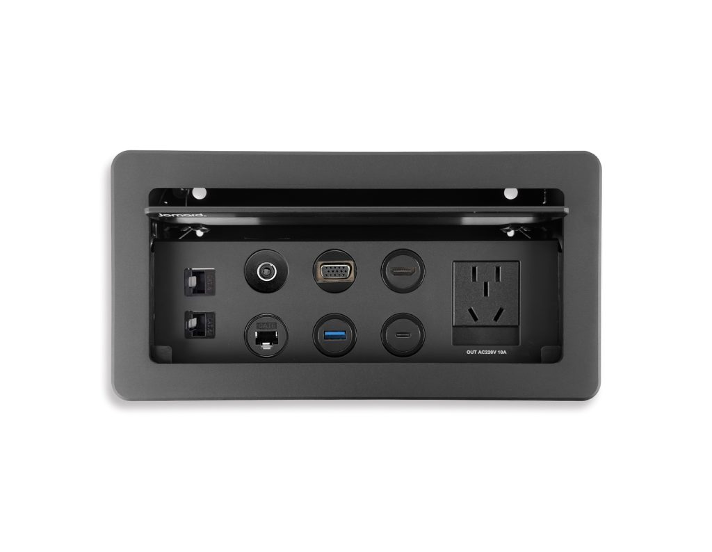 翻盖式媒体接口盒是在产品基础上改进开发,更好的解决了用户遇到的问题,增加了可靠性、适用性,使用更加方便。可隐藏于桌面安装,模块化搭配,有效解决各种外设线缆的简单、有序、美观的链接。采用翻盖式下沉隐藏装饰板,产品使用保持整洁与美观,适用于多种会议系统、学术交流、信息管理、网络办公及各种会展演示等领域的使用。